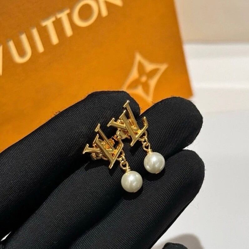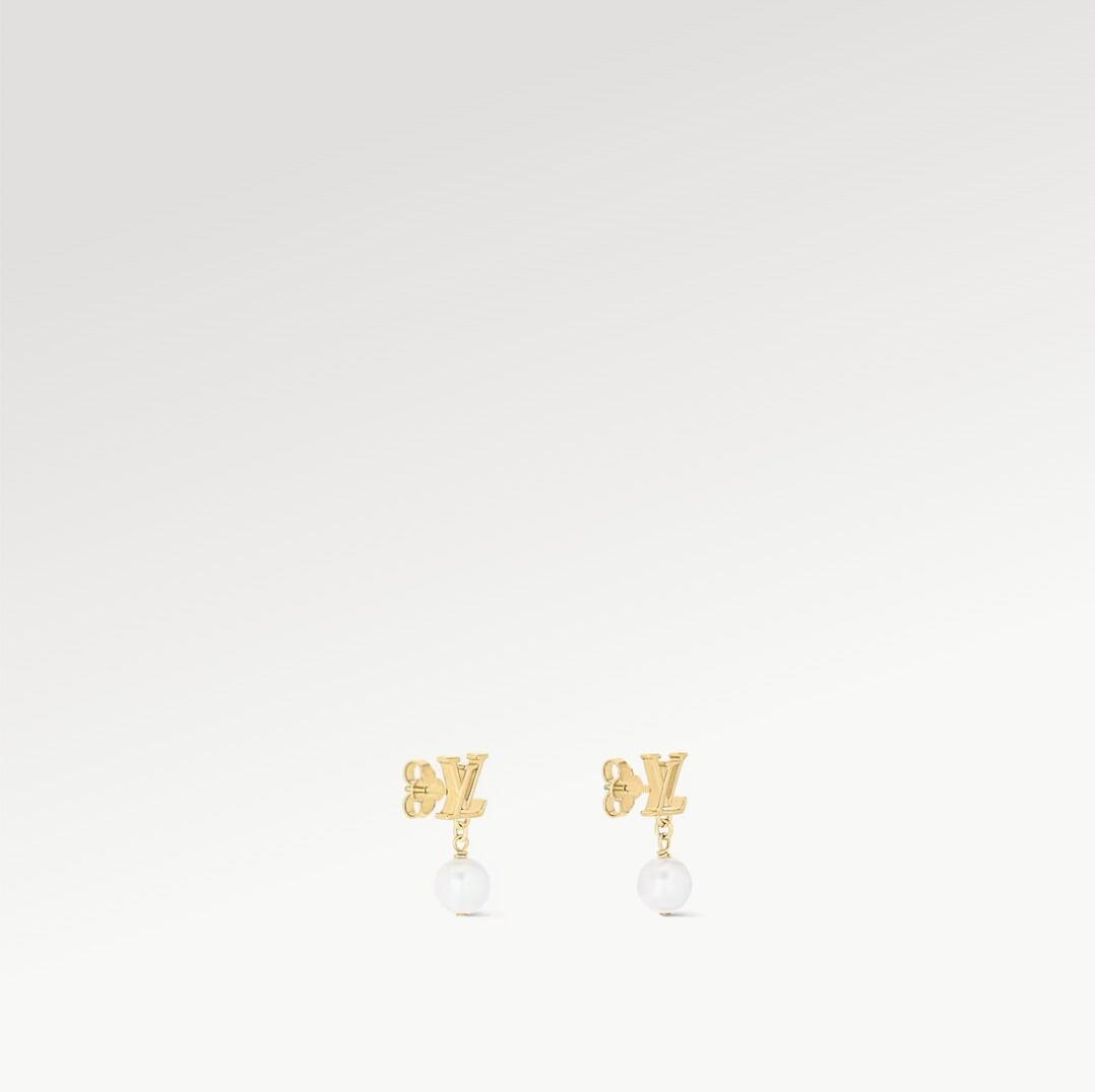 スタッズタイプのゴールドカラーのLV イニシャルから吊り下げられた、輝くホワイトレジンパールが特徴の繊細なデザインに仕上げました。