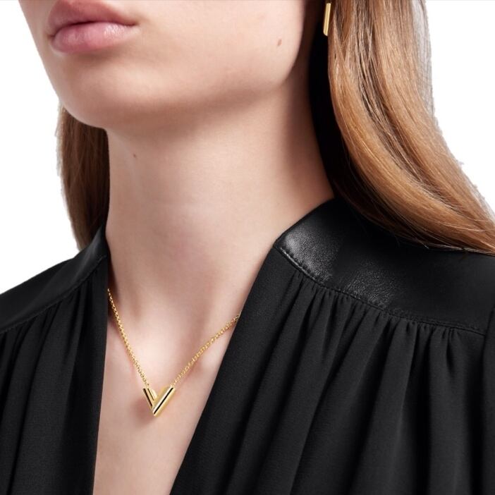 ルイ・ヴィトンのグラフィックVモチーフと、チェーンの留め金にLVサークルのサインを組み合わせた、しなやかなネックレスです。