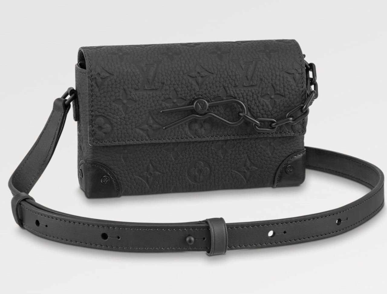 モノグラム・パターンをエンボス加工したトリヨンレザーで仕立てた「スティーマー・ウエアラブル ウォレット」。チェーンとピンの留め具など、ブラックの金具のディテールをあしらいました。所持品をしっかり収納できる、ファスナー式内ポケットも魅力です。調節可能なストラップ付きで、ショルダーバッグとしてもご使用いただけます。